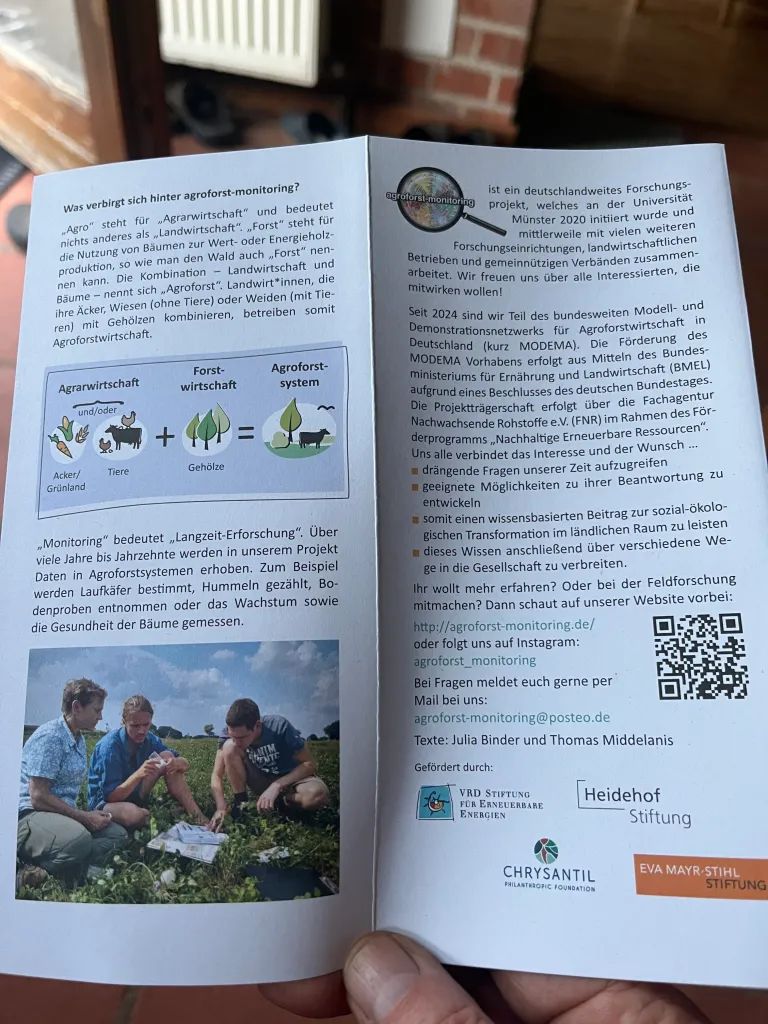 Im Rahmen eines interdisziplinären Forschungsprojekts untersuchen Wissenschaftler und Wissenschaftlerinnen der Universität Münster die ökologischen und landwirtschaftlichen Potenziale von Agroforstsystemen auf 18 Höfen in ganz Deutschland, darunter einem landwirtschaftlichen Betrieb in der Prignitz. Ziel des Monitorings ist es, wissenschaftliche Daten zu erheben und gleichzeitig praxisnahe Lösungen für eine nachhaltigere Landwirtschaft zu entwickeln. Agroforstwirtschaft – die Kombination von Bäumen mit landwirtschaftlichen Nutzpflanzen oder Viehhaltung – bietet vielfältige ökologische Vorteile. Sie gilt als ein vielversprechender Ansatz, um Bodenfruchtbarkeit zu verbessern, Wasser in der Landschaft zu halten, Biodiversität zu fördern und dem Klimawandel resilienter zu begegnen. Im Fokus des Monitorings stehen: