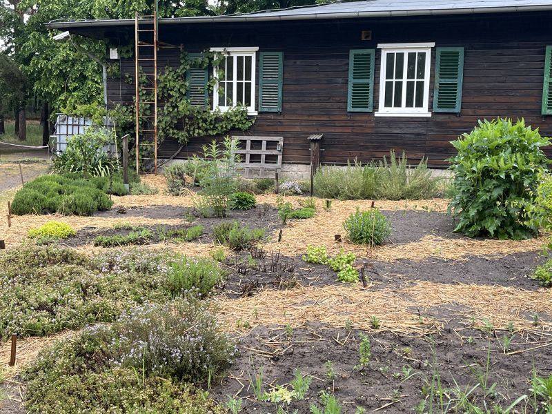 Bewegungs- und Spielflächen sind für vielfältige Angebote nutzbar, ebenso einige Spielgeräte. Es könnenZelte aufgebaut werden, eine Feuerstelle lädt zum Verweilen ein. Von alteingesessenen Einwohnern erfuhren wir, dass bereits die Ersteigentümer des Grundstücks vor 70 Jahren einen Garten bewirtschafteten. Wir nutzen diese Fläche und betätigen uns im ökologischen Anbau und verbessern die Bodenqualität. Wald- und Wiesenflächen bieten Möglichkeiten zur Beobachtung der Tier- und Pflanzenvielfalt und die Durchführung von Naturschutzprojekten. Selbst gebaute Nisthilfen und Fledermausquartiere werden von verschiedenen Arten genutzt. 2025 legten wir in einem Gemeinschaftsprojekt mit regionalen Partnern einen Naturteich neu an, der vor Jahrzehnten trockengelegt und mit Mischabfällen zugeschüttet wurde. Gemeinsam mit dem Imkerverein in Perleberg halten wir 3 Bienenvölker und verarbeiten den Honig. Außerdem leben auf der Farm mehrere Hühner und einen Hahn.