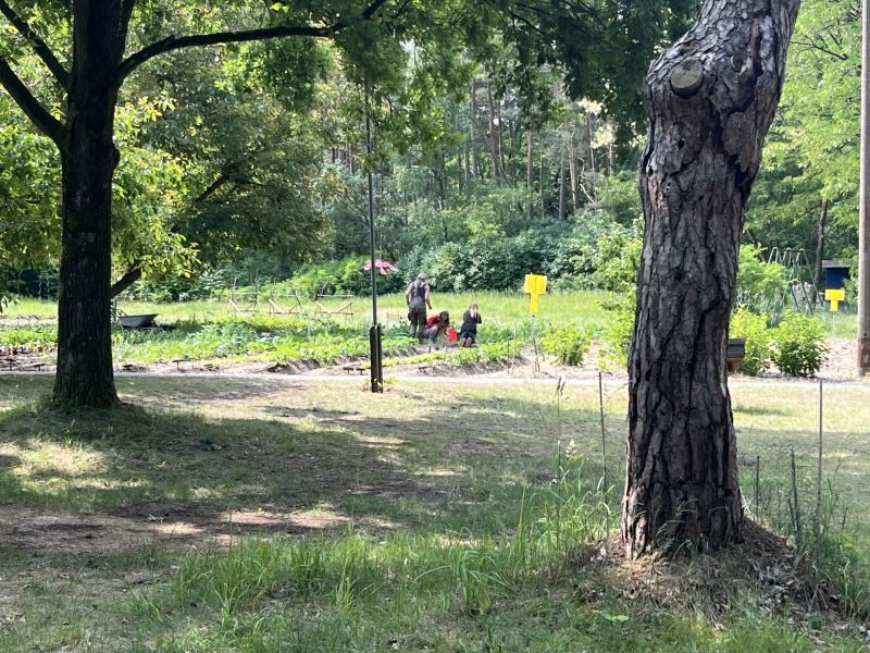 Bewegungs- und Spielflächen sind für vielfältige Angebote nutzbar, ebenso einige Spielgeräte. Es könnenZelte aufgebaut werden, eine Feuerstelle lädt zum Verweilen ein. Von alteingesessenen Einwohnern erfuhren wir, dass bereits die Ersteigentümer des Grundstücks vor 70 Jahren einen Garten bewirtschafteten. Wir nutzen diese Fläche und betätigen uns im ökologischen Anbau und verbessern die Bodenqualität. Wald- und Wiesenflächen bieten Möglichkeiten zur Beobachtung der Tier- und Pflanzenvielfalt und die Durchführung von Naturschutzprojekten. Selbst gebaute Nisthilfen und Fledermausquartiere werden von verschiedenen Arten genutzt. 2025 legten wir in einem Gemeinschaftsprojekt mit regionalen Partnern einen Naturteich neu an, der vor Jahrzehnten trockengelegt und mit Mischabfällen zugeschüttet wurde. Gemeinsam mit dem Imkerverein in Perleberg halten wir 3 Bienenvölker und verarbeiten den Honig. Außerdem leben auf der Farm mehrere Hühner und einen Hahn.