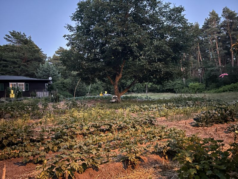 Bewegungs- und Spielflächen sind für vielfältige Angebote nutzbar, ebenso einige Spielgeräte. Es könnenZelte aufgebaut werden, eine Feuerstelle lädt zum Verweilen ein. Von alteingesessenen Einwohnern erfuhren wir, dass bereits die Ersteigentümer des Grundstücks vor 70 Jahren einen Garten bewirtschafteten. Wir nutzen diese Fläche und betätigen uns im ökologischen Anbau und verbessern die Bodenqualität. Wald- und Wiesenflächen bieten Möglichkeiten zur Beobachtung der Tier- und Pflanzenvielfalt und die Durchführung von Naturschutzprojekten. Selbst gebaute Nisthilfen und Fledermausquartiere werden von verschiedenen Arten genutzt. 2025 legten wir in einem Gemeinschaftsprojekt mit regionalen Partnern einen Naturteich neu an, der vor Jahrzehnten trockengelegt und mit Mischabfällen zugeschüttet wurde. Gemeinsam mit dem Imkerverein in Perleberg halten wir 3 Bienenvölker und verarbeiten den Honig. Außerdem leben auf der Farm mehrere Hühner und einen Hahn.