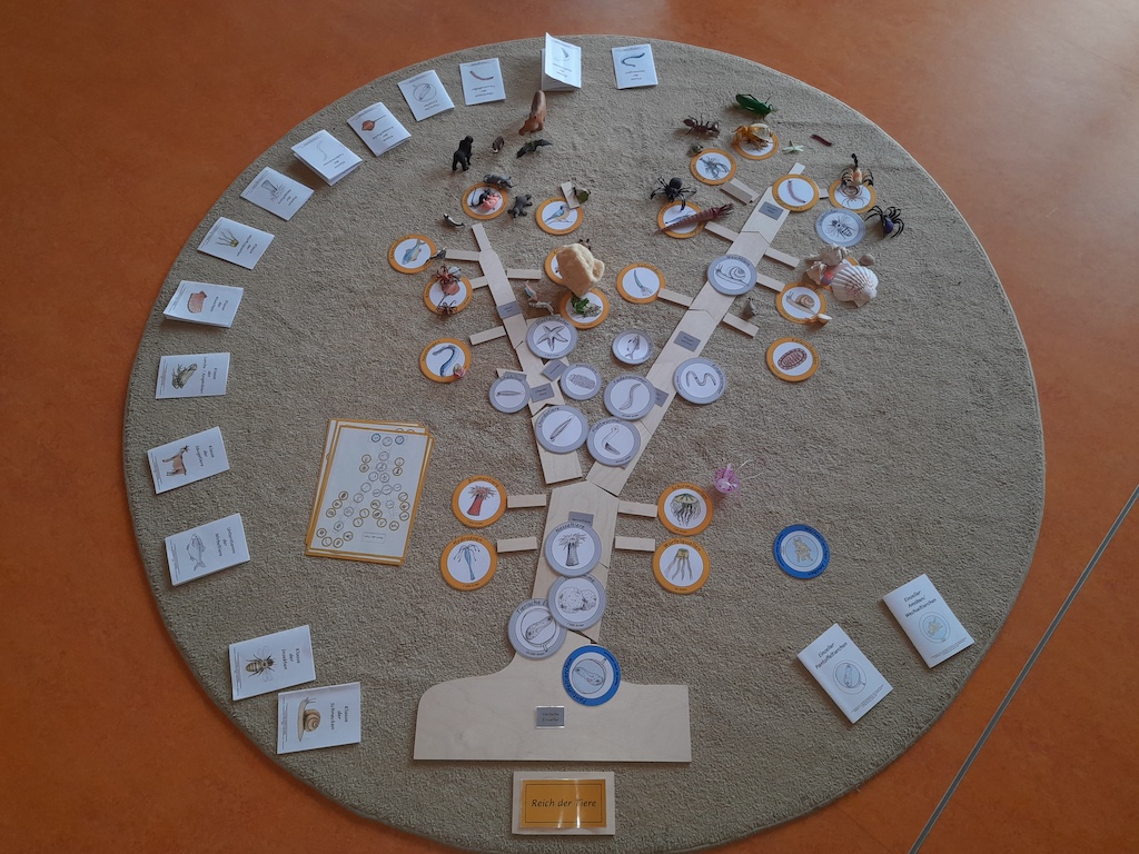 Insekt oder Spinnentier? Schädelloser oder Weichtier? Hydrozoa oder Kopffüßer? Schon frühzeitig standen im Januar diese und viele weitere solcher Fragen im Raum, als sich die Schüler der Igel- und Flamingo-Gruppe mit dem Stammbaum der Tiere befassten. Beeindruckend waren dabei die vielen Verzweigungen in der Krone dieses Baumes. Die Schüler staunten über die zahlreichen Klassen, Stämme und Unterstämme, in die wir die Tiere unseres Planeten einordnen können. Zu jedem Bereich gab es jeweils ein Booklet mit Informationen zu den körperlichen Merkmalen, zur Nahrung und zum Verhalten der Lebewesen, welche diesem Bereich angehören. Diese Infos, sowie die dazugehörigen Zeichnungen und Abbildungen, übernahmen sich die Schüler in ihr Kosmisches Buch. Manche waren so engagiert, dass sie mehr als fünf Booklets durcharbeiteten.